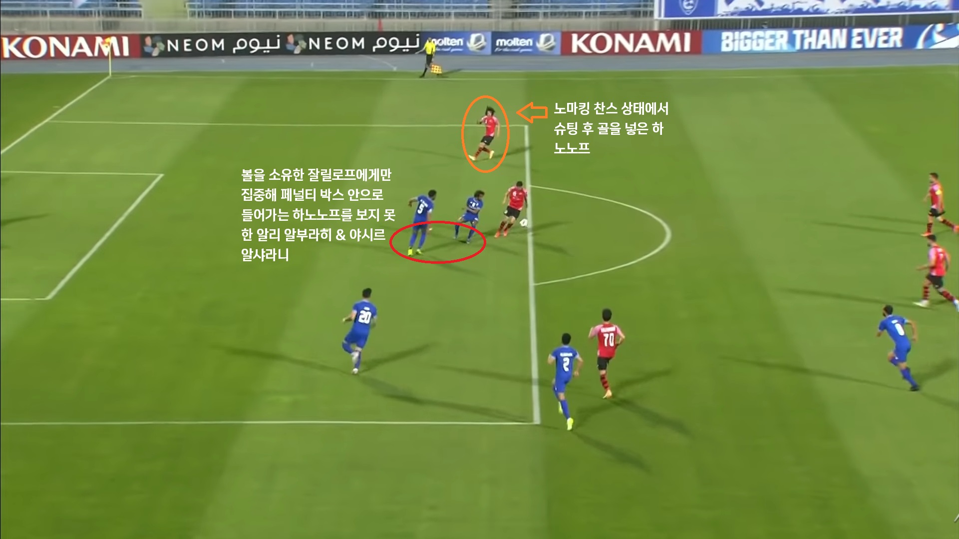 필자가 경기를 지켜보다 한 가지 흥미로운 장면을 발견했다. 바로 3차전과 4차전, 똑같은 루트로 실점한 장면이 있다는 것이다. 3차전 알힐랄이 기록한 유일한 실점 장면에선 알리 알부라히와 야시르 알샤라니가 볼을 소유한 잘릴로프에만 집중 마크하는 동안 하노노프가 측면에서 페널티 박스 안으로 돌파 후 그대로 슈팅하며 골을 넣었다. 하노노프를 막아야 할 알샤라니는 볼에만 집중하다 공간을 파고드는 상대를 보지 못하며 동점골을 헌납했다.