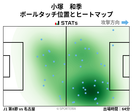 이번 시즌 카즈키가 선발로 나온 8라운드 나고야 전 패스맵과 히트맵을 보자. 이 날 카즈키는 4-1-2-3 포메이션에서 2섀도우 메짤라 역할로 나왔다. 패스맵과 히트맵을 보면 상황에 따라 중원에서부터 시작해 인사이드 하프(메짤라) 내지 윙에 가까운 수준으로 측면까지 올라가 공격 작업에 참여하는 것을 알 수 있다. 카즈키가 수원에 온다면 중원과 하프 스페이스에서 전진성과 창의적인 패스를 통해 수원의 공격을 풀어나갈 키플레이어로 맹활약할 것으로 기대한다.